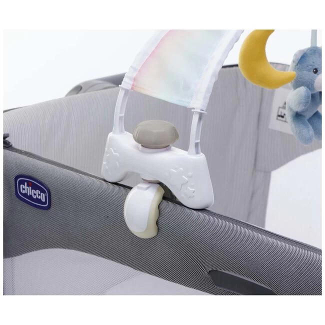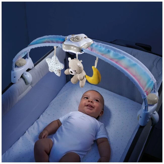 Deze 2-in-1 bedboog is wel als bedboog als los nachtlampje te gebruiken voor je kindje. De bedboog heeft een mooi regenboog printje met daaraan drie zachtje knuffeltjes. Hier kan je kindje naar kijken en grijpen. De bedboog heeft een nachtlampje die je kindje helpt in slaap te vallen door zijn zachte licht. Als laatste beschikt de boog ook over verschillende klassieke melodiën. Zowel licht als geluid zijn met een timer in te stellen (15 of 30 min) en zal de laatste 5 minuten steeds zachter worden zodat je kindje rustig in slaap kan vallen. Werkt op 3x AAA baterijen (exclusief)