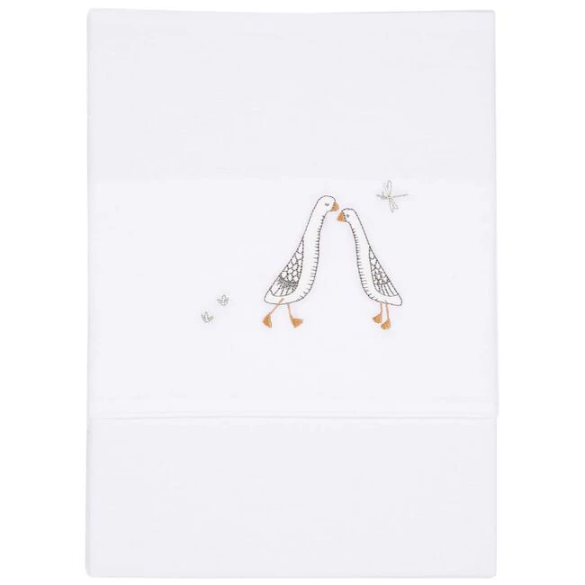 Dit Little Dutch Little Goose lakentje is wit van kleur en heeft een geborduurd patroontje. Het lakentje is gemaakt van 100% katoen en voelt heerlijk zacht aan. Afmeting: 70 x 100 cm. Wassen op 30 graden; strijken op een lage temperatuur. Dit product is niet geschikt om te drogen in de droger.