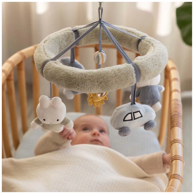 Deze mooie muziekmobiel speeltje het bekende deuntje: nijntje, lief klein konijntje. Draai het muziekdoosje aan en volg alle figuurtjes die rondzweven. Je kindje kan zich zo uren vermaken en stimuleert daarbij de visuele ontwikkeling. De mobiel is eenvoudig te bevestigen aan de box of aan het ledikant d.m.v. de draaiknop. Leeftijd: vanaf de geboorte tot 6 maanden.