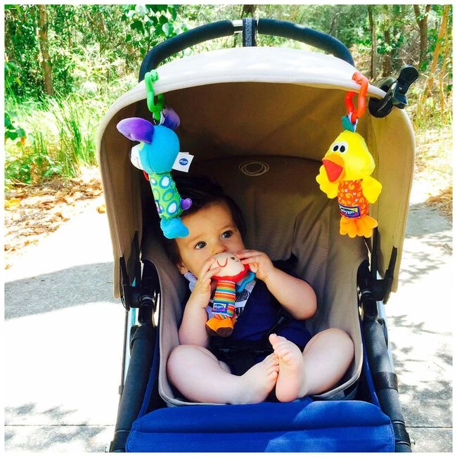 De bevestigingsclips van dit tinkelende trio zijn ideaal om op te bijten bij doorkomende tandjes. De felle kleuren en belgeluiden zullen je kindje onderweg zeker bezighouden! De grappige vogel, hond en koe zorgen voor speelplezier thuis en onderweg met hun rinkelende belletjes en felle kleuren. Je maakt ze eenvoudig vast aan de autostoel, kinderwagen, of buggy. Geschikt vanaf de geboorte.