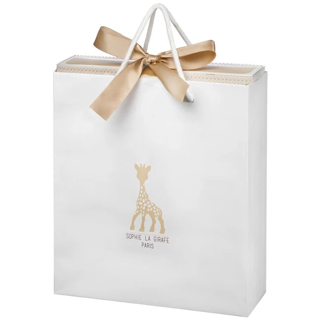 Mooie cadeauset uit de Sophiesticated serie, de ideale collectie om een kindje welkom te heten. Deze cadeauset bevat: Sophie de giraf bijtspeeltje, Sophie de giraf zachte maracas rammelaar, Sophie de giraf wenskaart en een Sophie de giraf cadeautasje met zijden linten. Het bijtspeeltje is gemaakt van 100% natuurlijke rubber en verf, volledig veilig en stimuleert alle zintuigen van de baby. Haar grote formaat (17 cm) maakt ieder kindje blij! De rammelaar is gemaakt van kunstof en katoen. Als het kindje de rammelaar schudt, hoort en ziet hij gekleurde balletjes die tegen elkaar botsen. De onderkant van de rammelaar is gemaakt van knisperstof en bevat labels om aan te raken. Afmeting rammelaar: 6 x 6 x 17 cm. Met de wenskaart en het cadeautasje kun je het bijtspeeltje en de rammelaar zelf mooi verpakken om als luxe cadeau te geven. Afmetingen van de doos: 22 x 23 x 7 cm.
