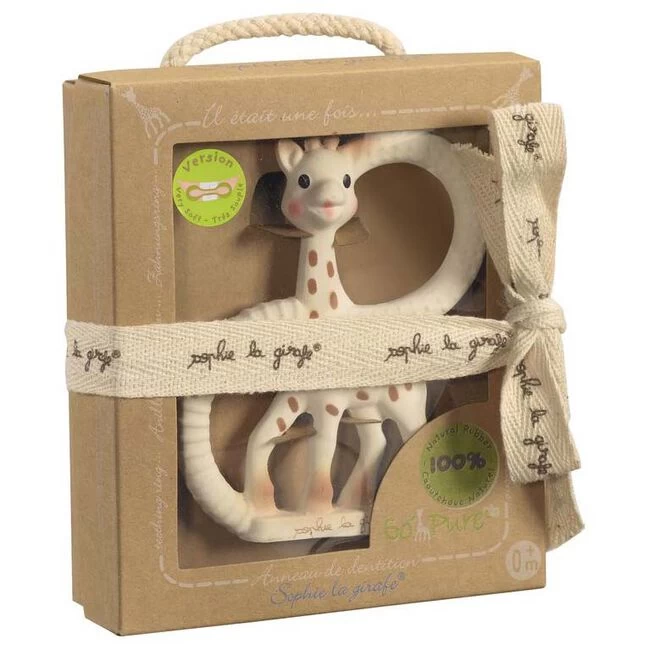 De eerste bijtring gemaakt van 100% natuurlijk rubber! Perfect om het pijnlijke tandvlees van je baby te verzachten. Deze bijtring is, net als Sophie de Giraf, gemaakt van 100% natuurlijk rubber afkomstig van de Braziliaanse rubberboom (Hevea). De bijtring van Sophie de Giraf is van natuurlijke materialen en bevat tal van plekjes waarop gekauwd kan worden (oren, hoornen, poten en de ringen). Deze bijtring is ideaal tijdens het doorkomen van de melktanden. De 2 ringen hebben verschillende texturen. De twee ringen zijn licht en voor de kleine handjes, eenvoudig vast te plakken en te hanteren. Ook leuk als kraamcadeau!