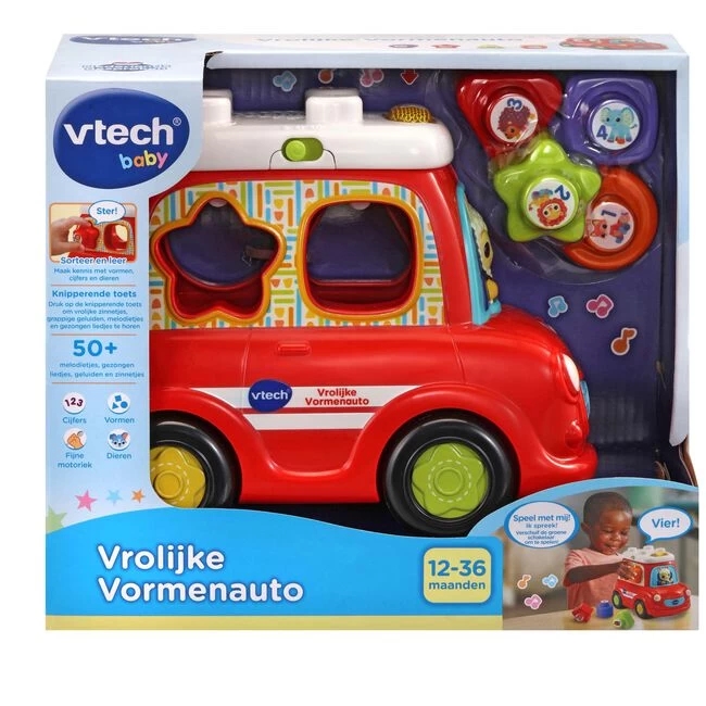 Laten we een ritje maken met de vrolijke vormenauto van Vtech! Druk op de knipperende toets om grappige geluiden, vrolijke zinnen en gezongen liedjes en melodietjes te horen. Plaats de vormen in de juiste opening en maak kennis met vormen, cijfers en tellen. Geschikt voor kindjes vanaf 1 jaar.