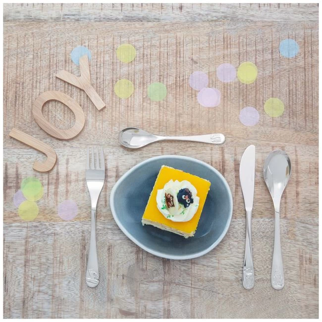 Eten wordt nog leuker met dit Zilverstad kindercouvert met bosdieren. Het 4-delige bestekje is vervaardigd uit 18/10 RVS en kan in de vaatwasser. De bestek-set wordt geleverd in een bijpassende geschenkverpakking. Het bestek is geschikt om gegraveerd te worden. Leuk als kraam- of verjaardagscadeau. Afmetingen kindervork: 170 mm, kindermesje: 179 mm, kinderlepel: 170 mm en paplepel: 135 mm